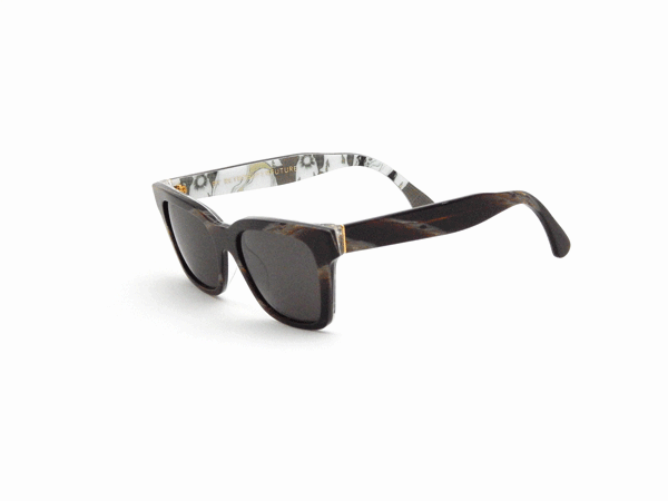 América Motorcycle has been created in collaboration with the Japanese artist Keiichi Tanaami, known for its psychedelic art. In this brown acetate sunglasses, a drawing of the artist is shown on the inside. Black lenses by Zeiss.